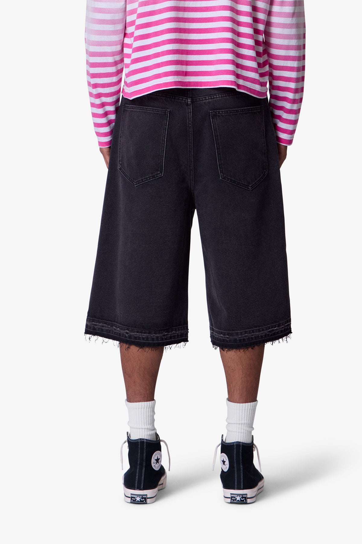 Constructed from a cotton-poly blend with a vintage black wash. these longline denim shorts feature a baggy Y2K-inspired silhouette with an extended inseam. Finished with subtle whiskering and faded detailing at the thighs for a worn-in look. The raw-cut released hem adds fraying detail at the edge.