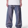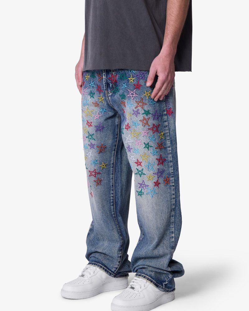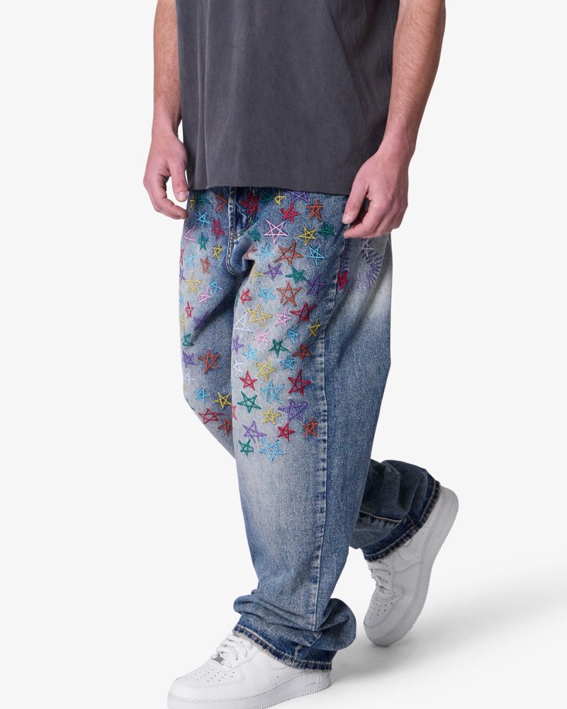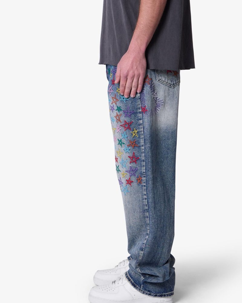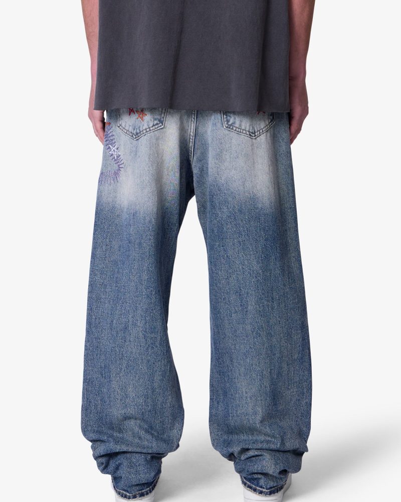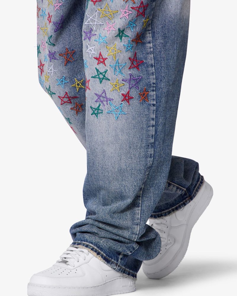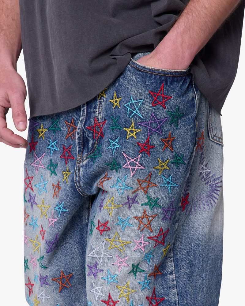Constructed from 13 oz 100% cotton denim in a medium vintage blue wash. this pant features an oversized. baggy fit with embroidered multi-colored star motifs throughout. Light distressing at the hem adds subtle texture. Finished with a five-pocket layout and standard belt loops.