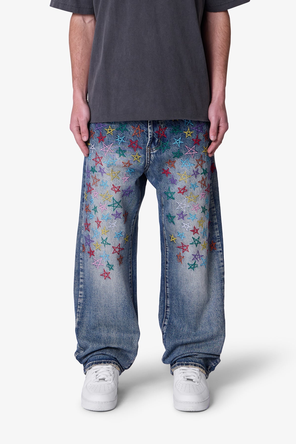 Constructed from 13 oz 100% cotton denim in a medium vintage blue wash. this pant features an oversized. baggy fit with embroidered multi-colored star motifs throughout. Light distressing at the hem adds subtle texture. Finished with a five-pocket layout and standard belt loops.