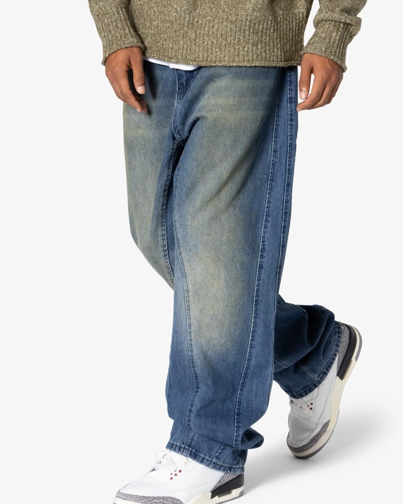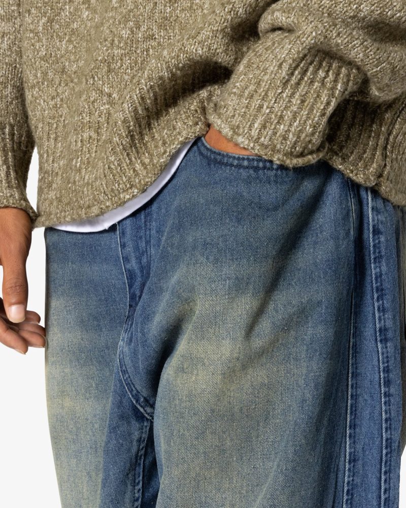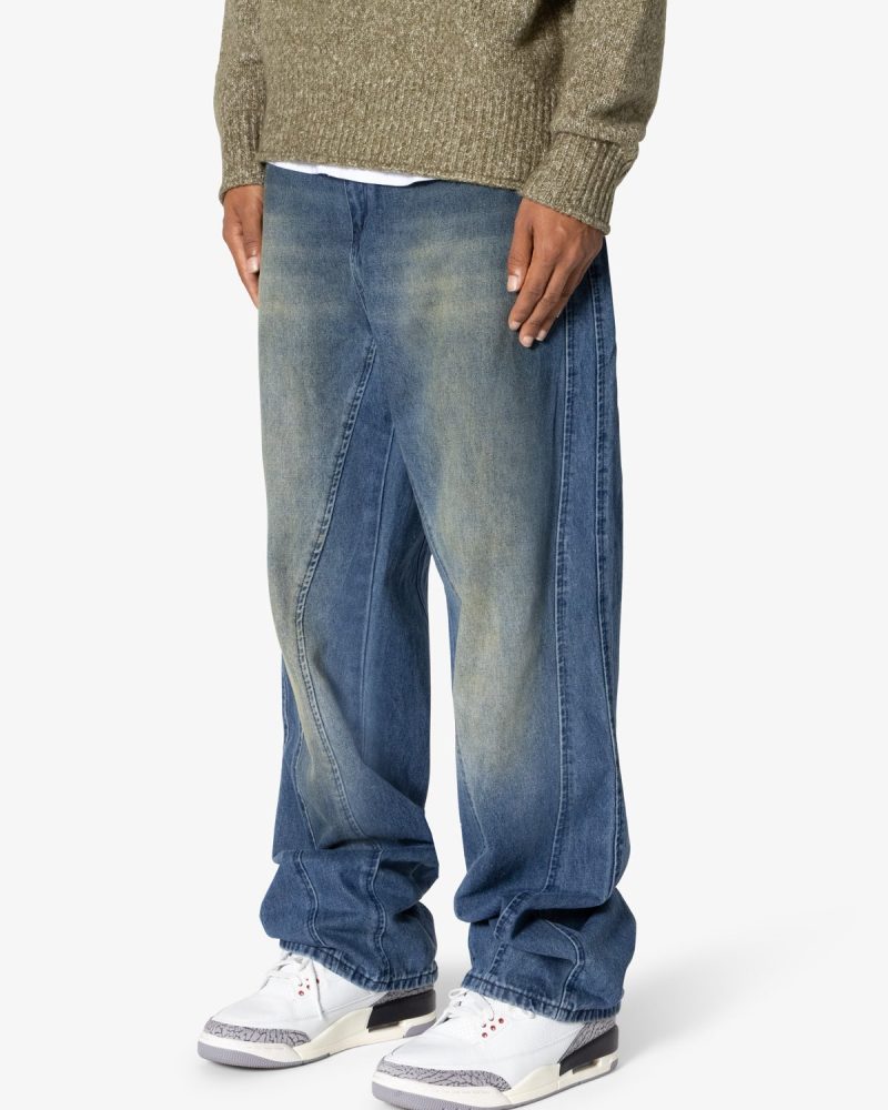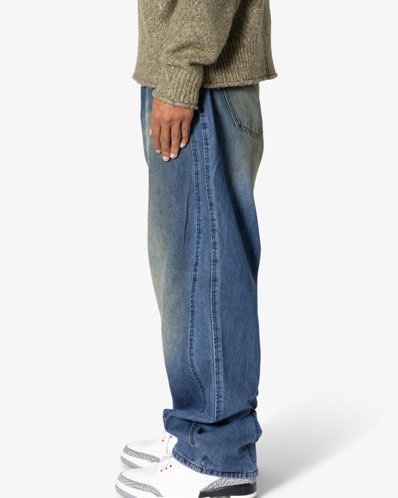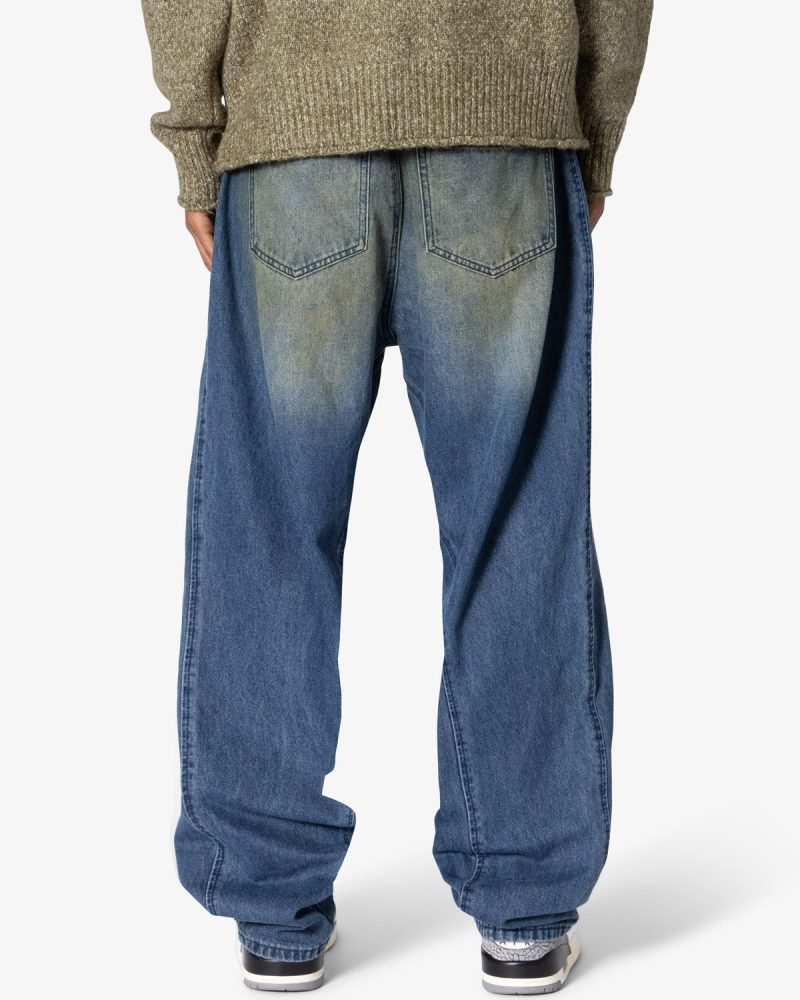the Ultra Baggy Tower Denim is designed with a new oversized ultra baggy fit. constructed from 100% cotton denim with a medium base wash. gradient spray technique. and dual inseam and outseam lining adding a dimensional draping.