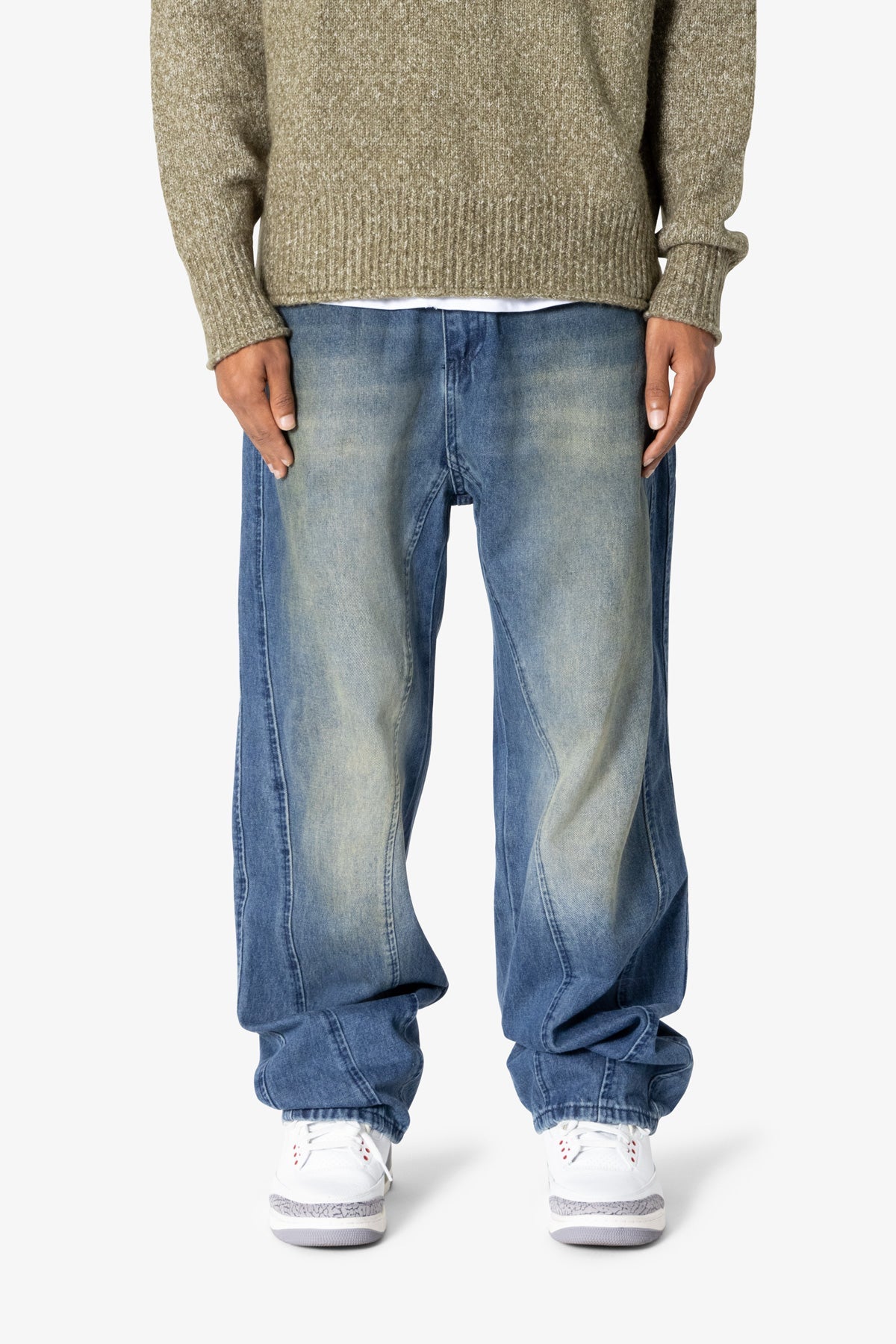 the Ultra Baggy Tower Denim is designed with a new oversized ultra baggy fit. constructed from 100% cotton denim with a medium base wash. gradient spray technique. and dual inseam and outseam lining adding a dimensional draping.