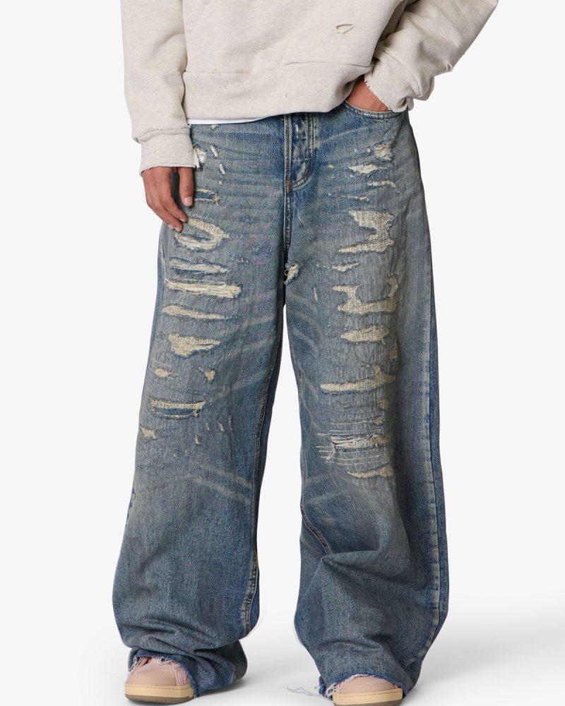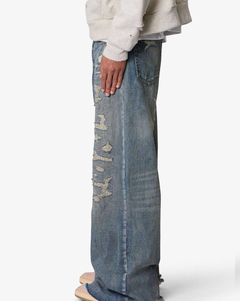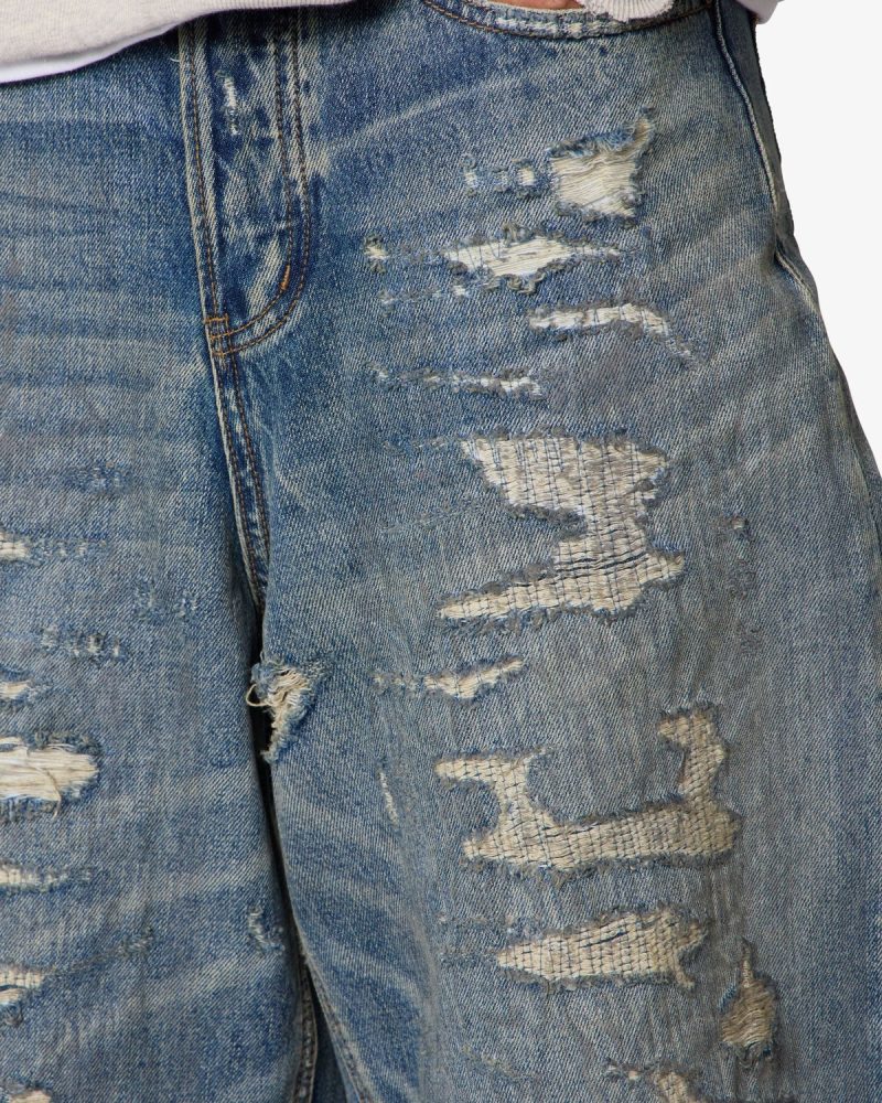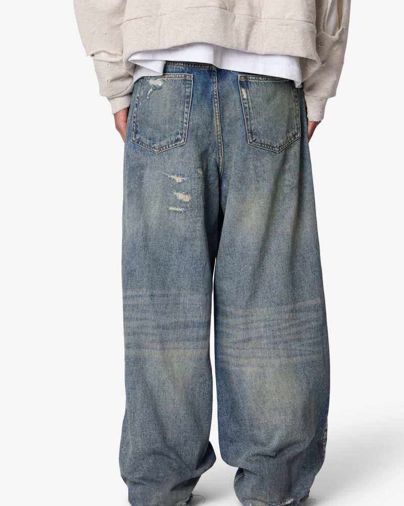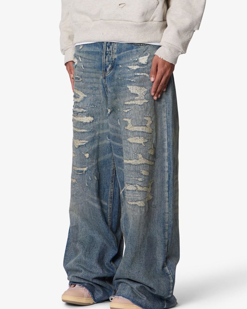 The Ultra Repaired Rave Denim features a baggy silhouette constructed from 100% cotton denim with a stone wash and pp spray finish. Designed with a dark stone-washed base and layered antique wash. the jeans showcase multiple rips. raw edge holes. and repaired denim patches with boro stitching. Additional details include whiskering. sanding. raw hems. and distressing at the back ankle. Finished with a standard waistband. five-pocket layout. and button fly.