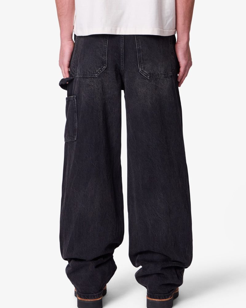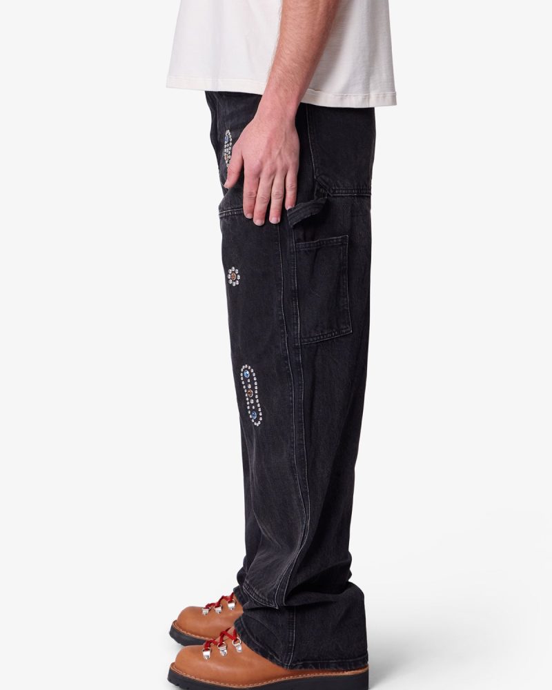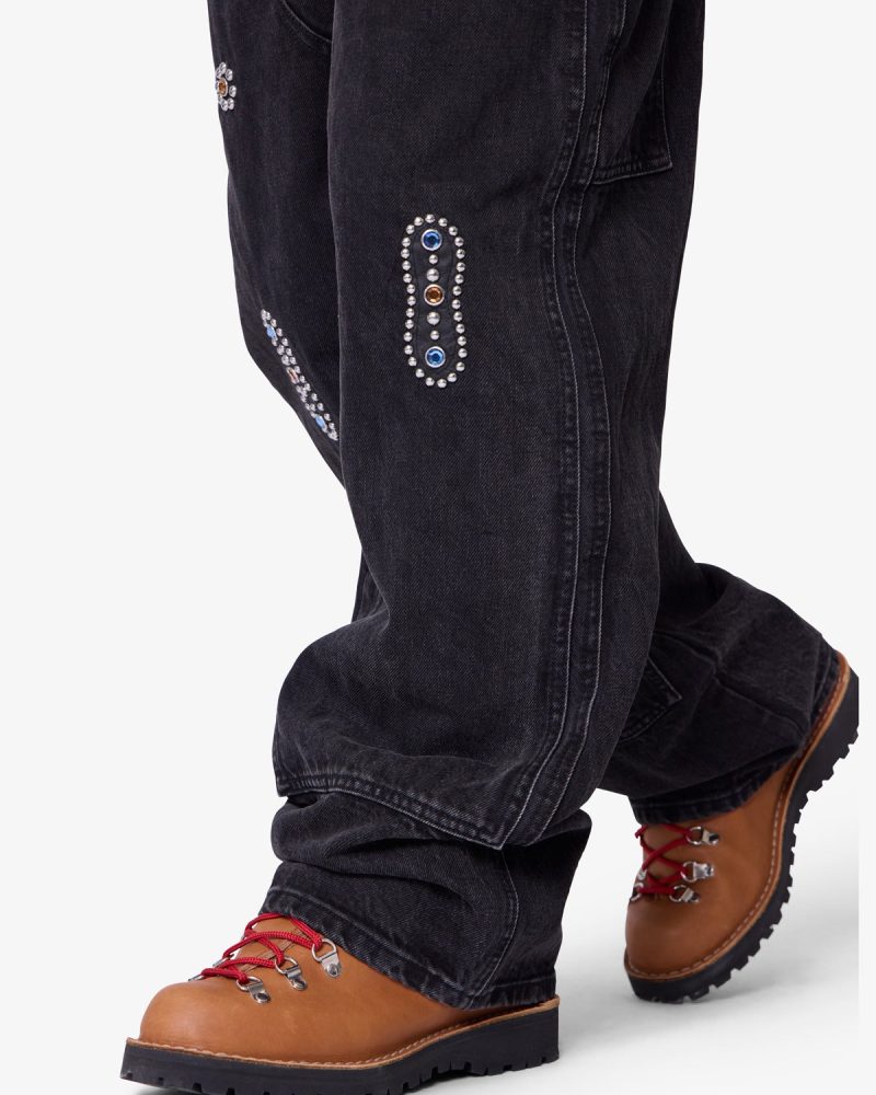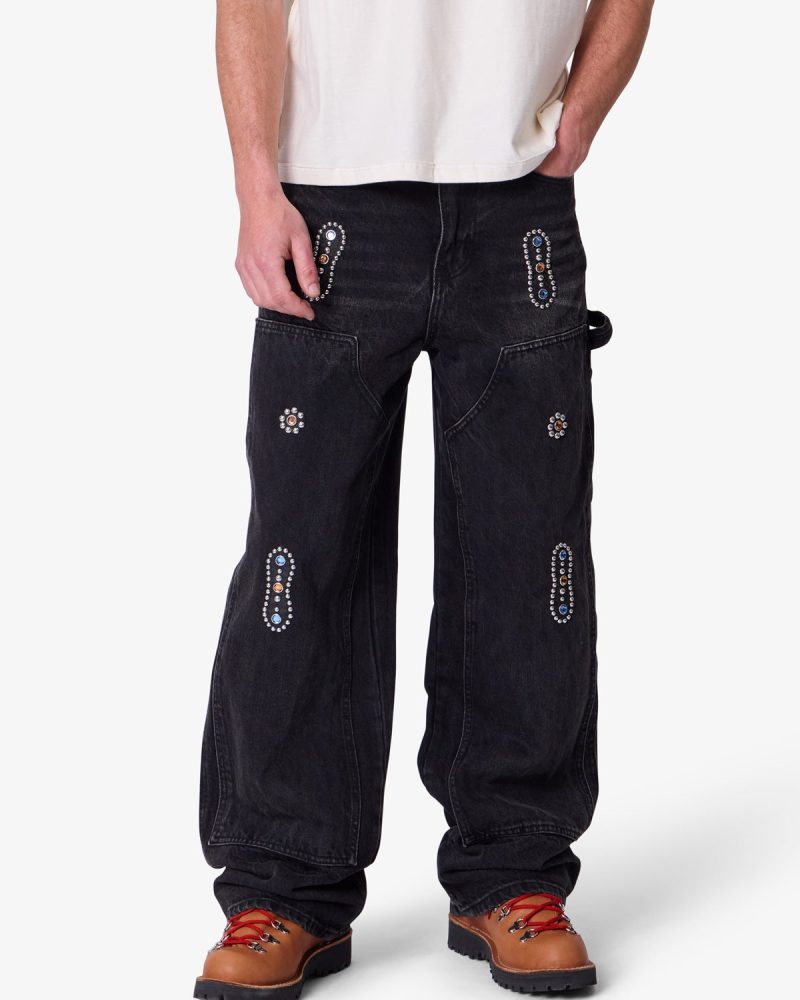 Part of our . the V734 Western Jewel Denim is constructed from 100% cotton denim in a medium blue wash. Designed with a baggy fit. it features jewel and leather patch applique. a studded applique patch. and double knee construction. Functional workwear details include a hammer loop and work pocket.