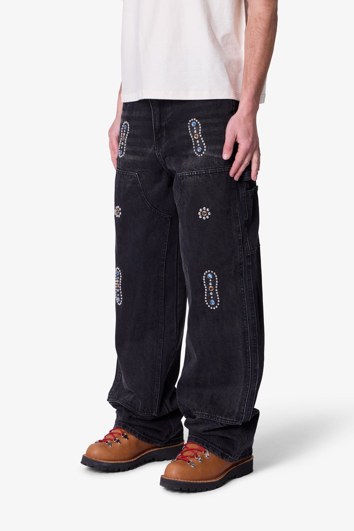 Part of our . the V734 Western Jewel Denim is constructed from 100% cotton denim in a medium blue wash. Designed with a baggy fit. it features jewel and leather patch applique. a studded applique patch. and double knee construction. Functional workwear details include a hammer loop and work pocket.