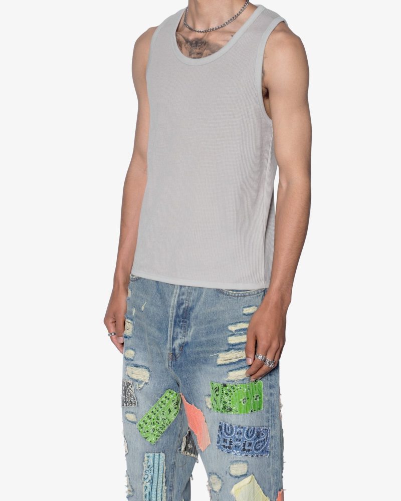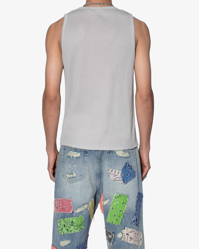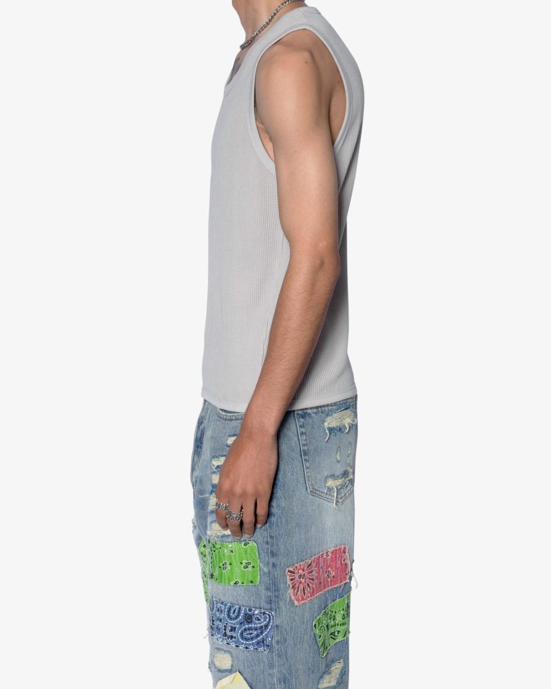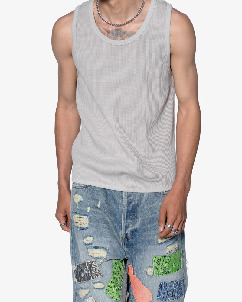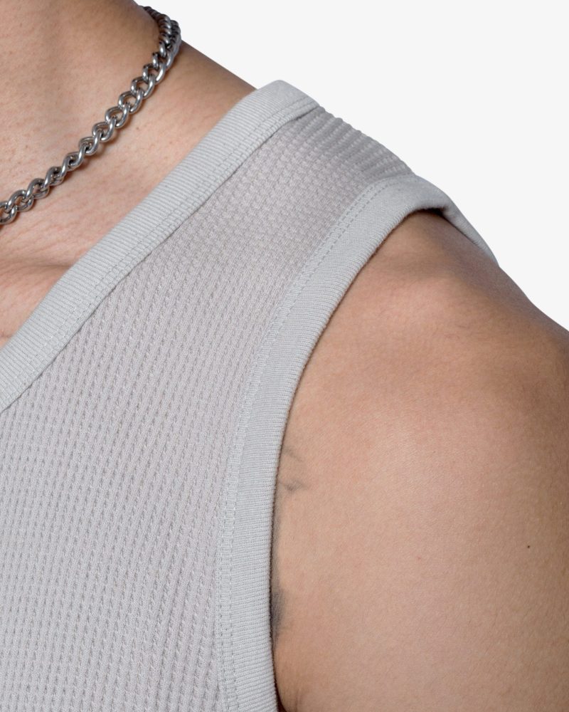 the Waffle Knit Tank is a 100% cotton tank is perfect as a base layer or worn alone. the tank features taping at the neck and arm openings. a flat hem. and is constructed in a ribbed material.