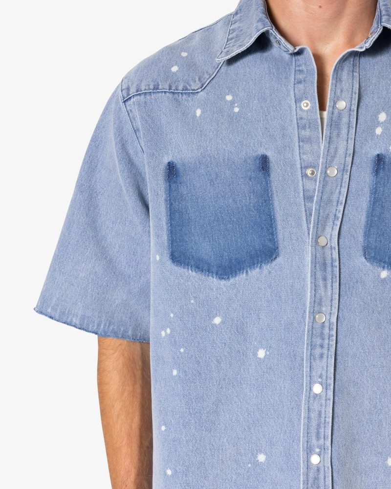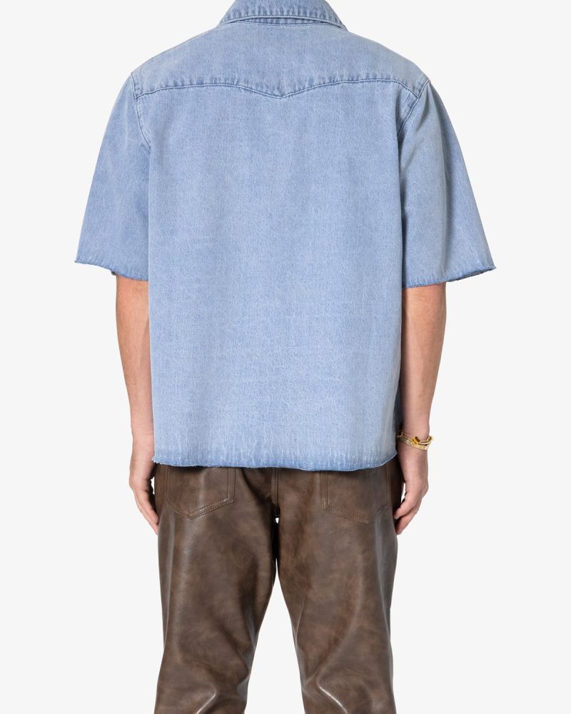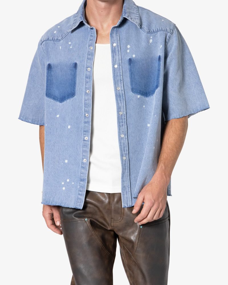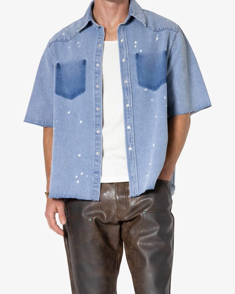 the Washed Denim Button Up Shirt is made from a 100% cotton fabric. light blue base wash. mis-contrast pocket shadowing. bleach spotting. unreleased hem. and white mother of pearl button snaps.