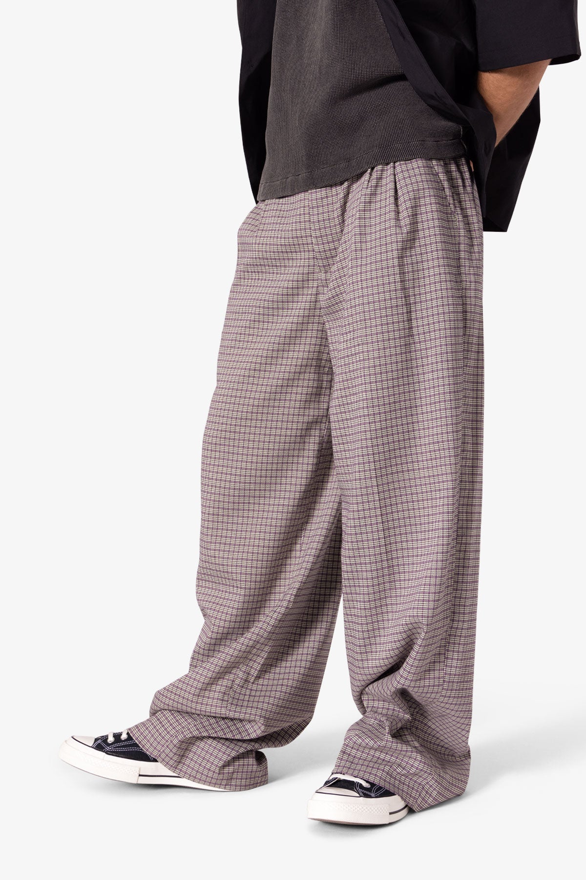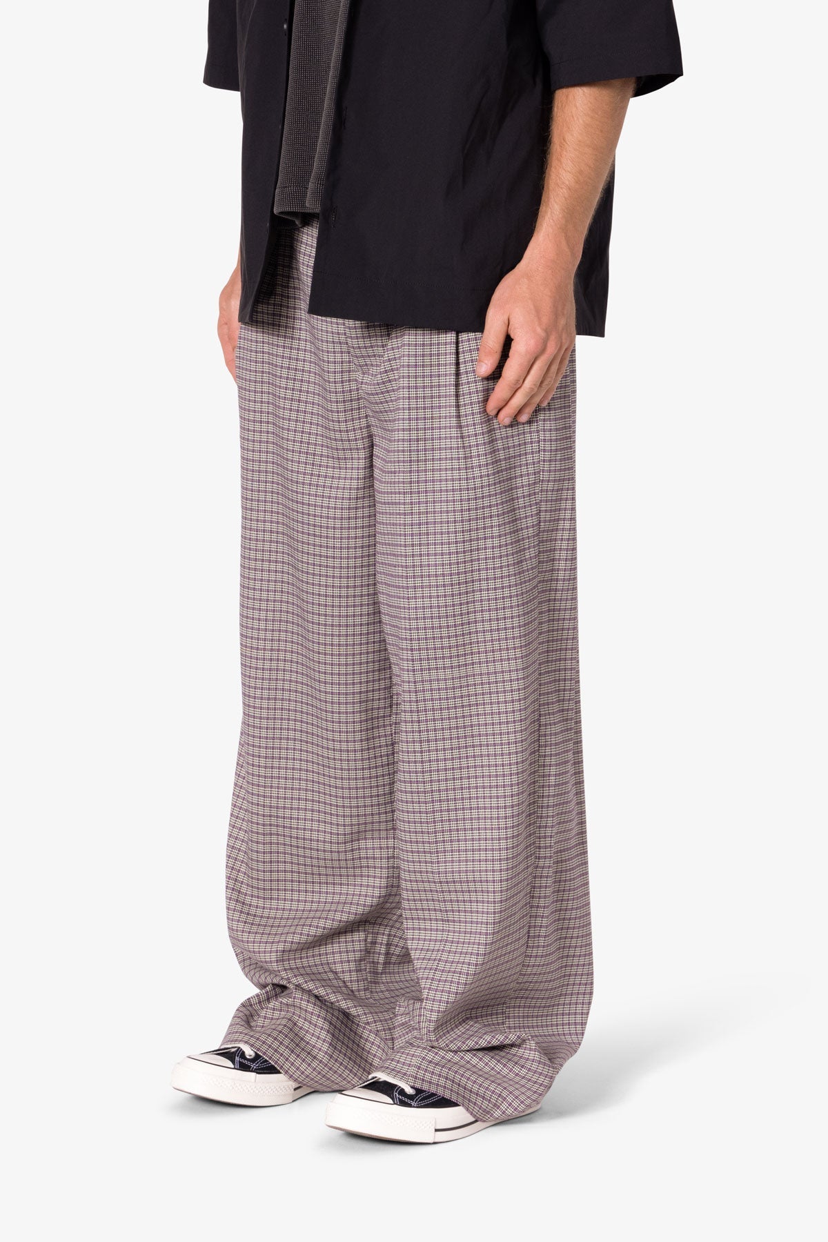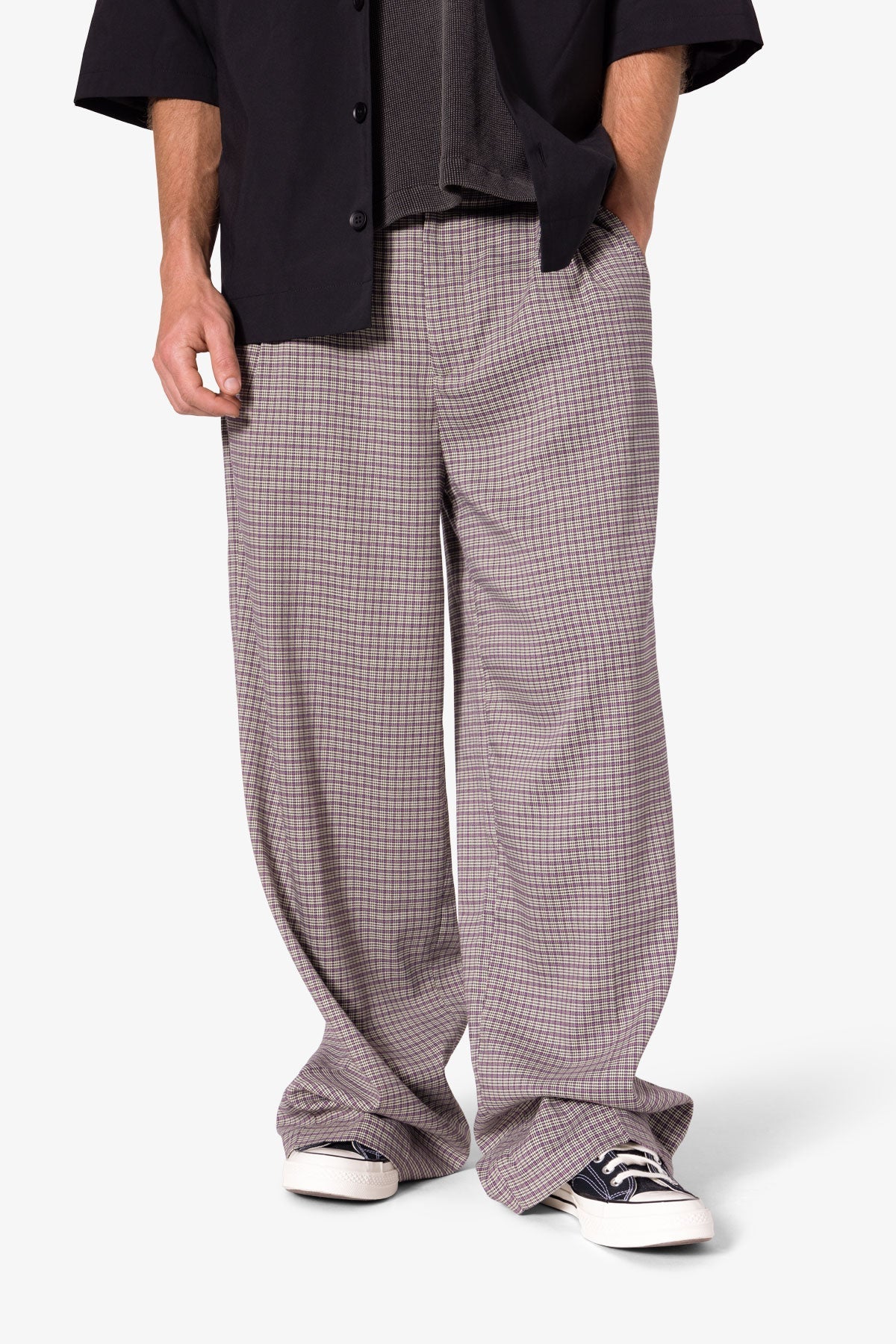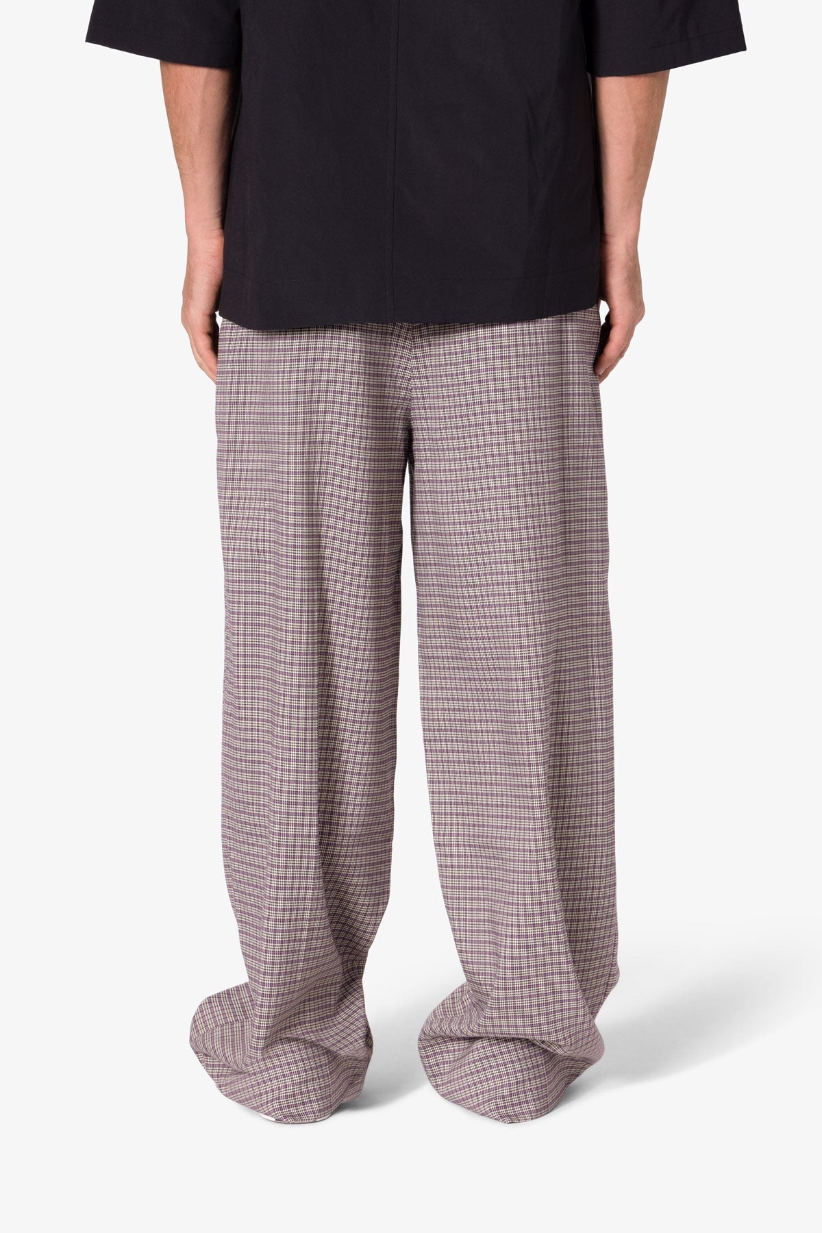the Wide Leg Trouser Pants are designed with a baggy. relaxed fit throughout. featuring welt pockets at the outseam and patch pockets on the back. and is constructed from a custom developed striped cotton fabric.