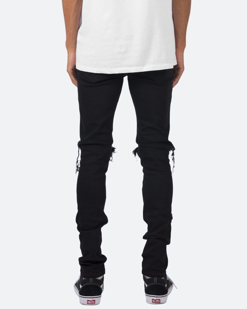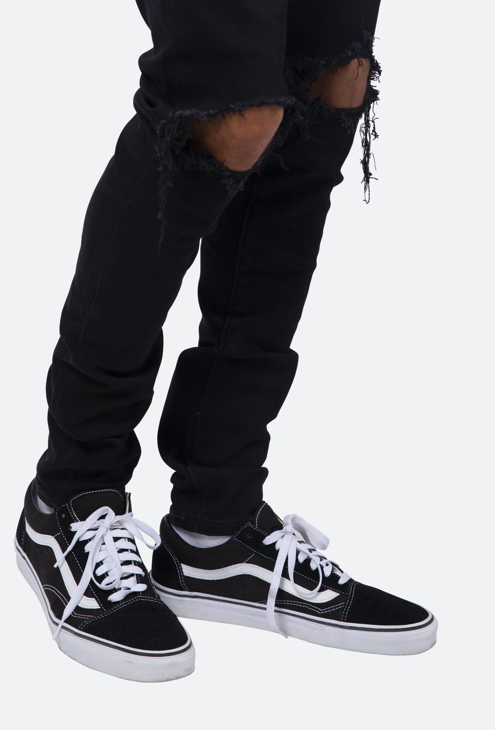 the X1 Skinny Denim is designed with our new X fit which is skinny throughout with an extended inseam for stacking. and features a vintage black wash and custom distressing at the knees.