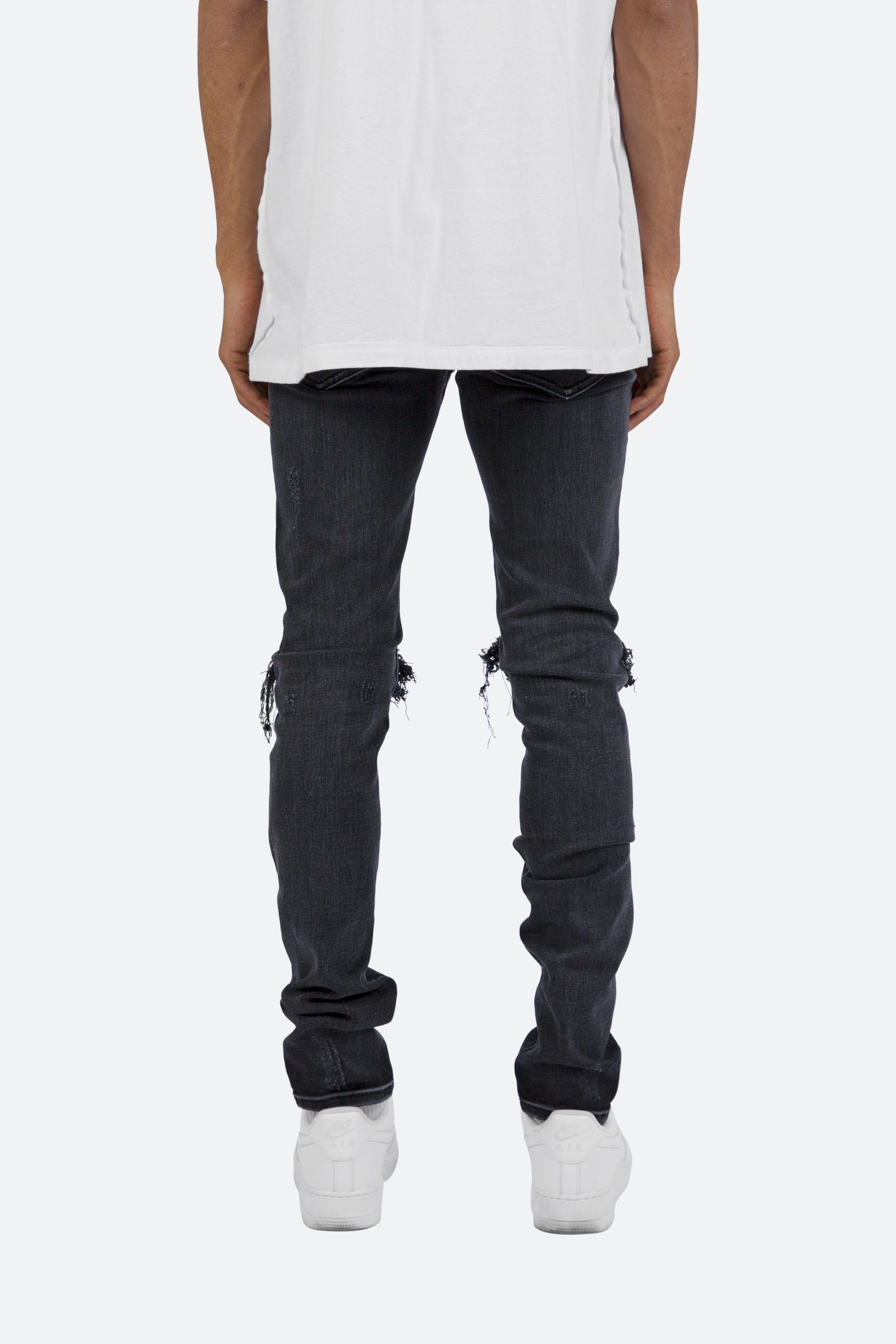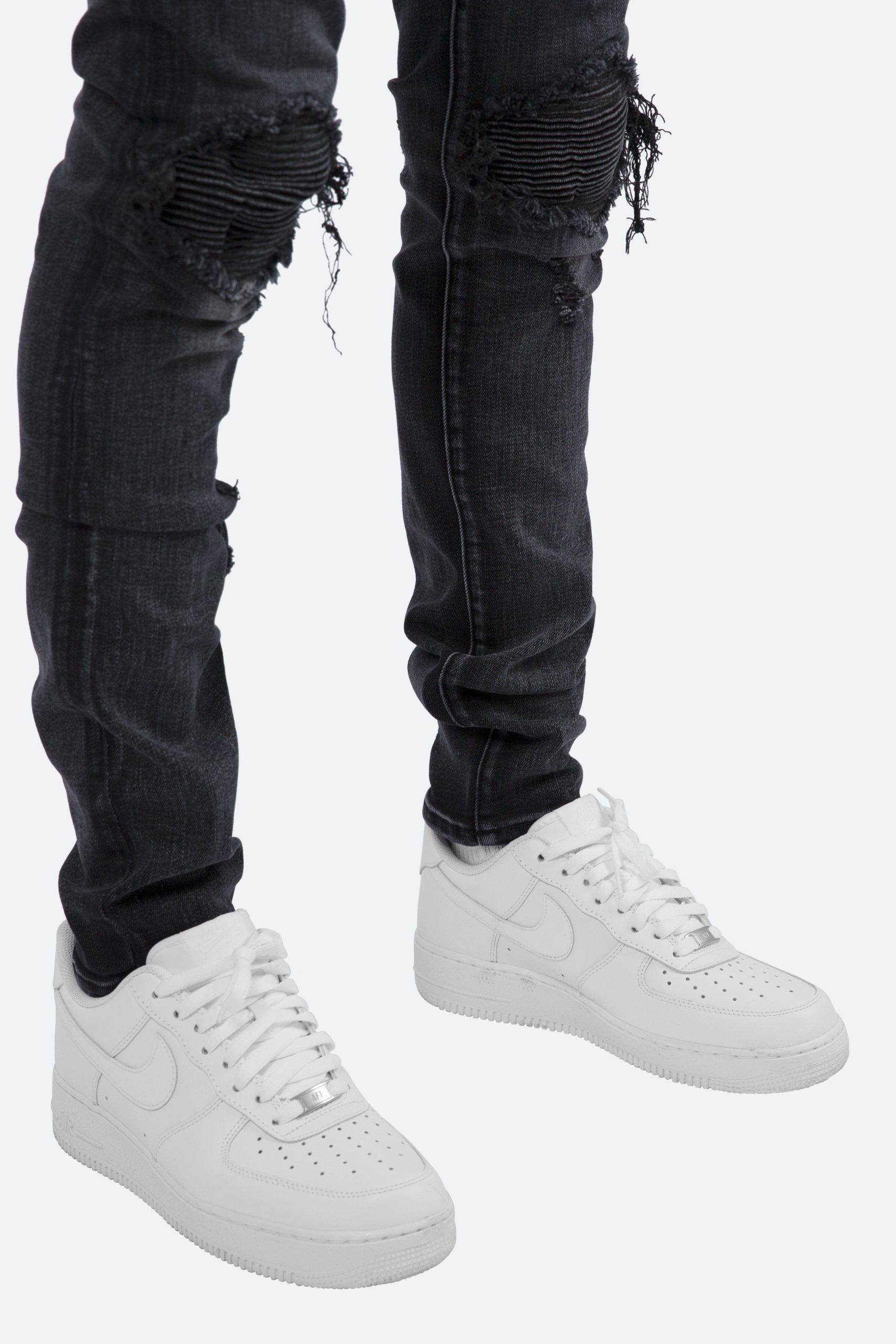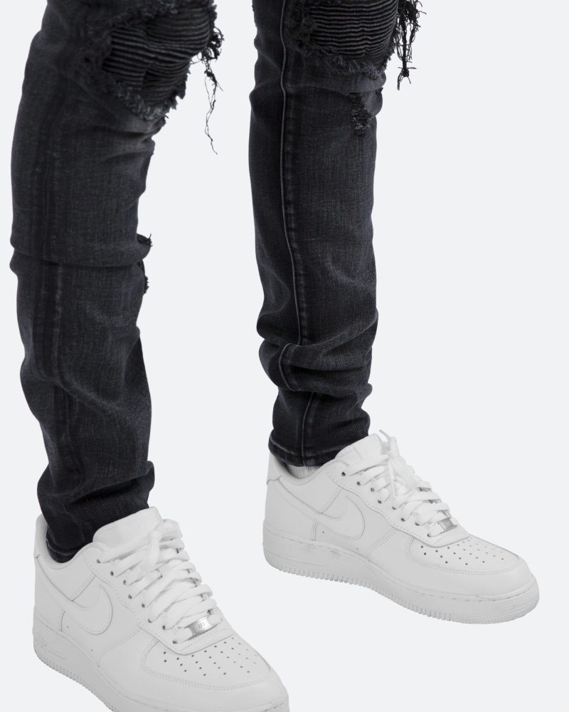 the X162 Stretch Denim is designed with our new X fit which is skinny throughout with an extended inseam for stacking. and features a vintage wash. distressing throughout and finished with pin-tucked denim panels repairing the knee holes.