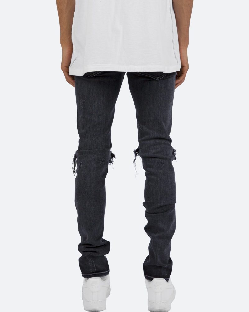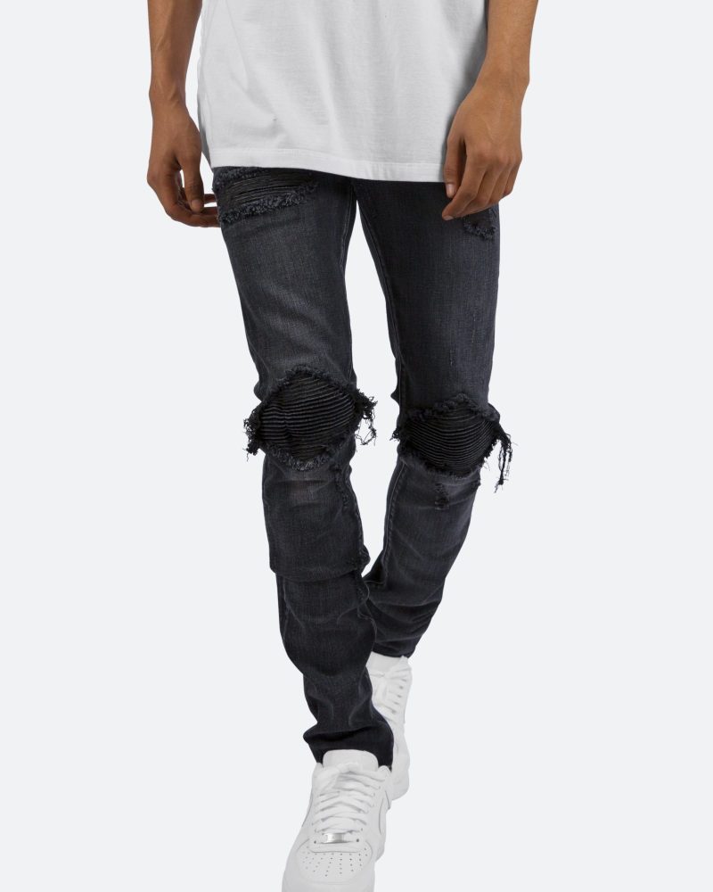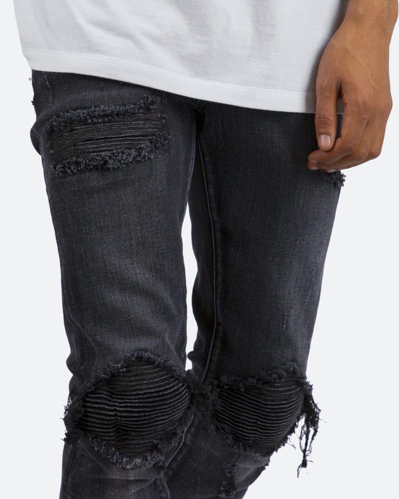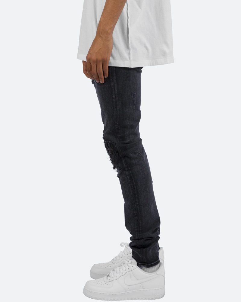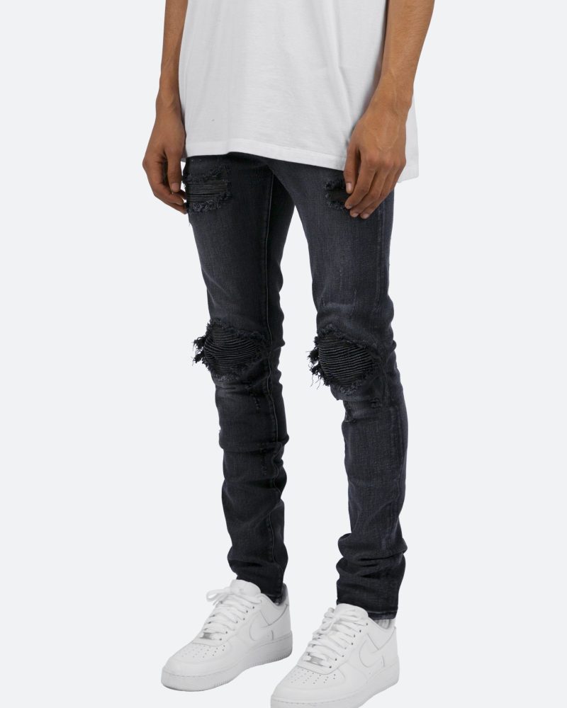 the X162 Stretch Denim is designed with our new X fit which is skinny throughout with an extended inseam for stacking. and features a vintage wash. distressing throughout and finished with pin-tucked denim panels repairing the knee holes.