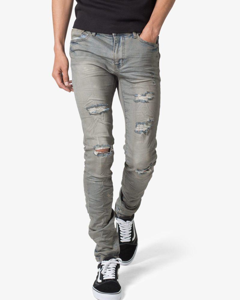 the X607 Painted Skinny Denim is designed with our X fit. which is skinny throughout with an extended inseam for stacking. and features a vintage blue wash with a dirt tint. paint details throughout. and finished with distressing details.