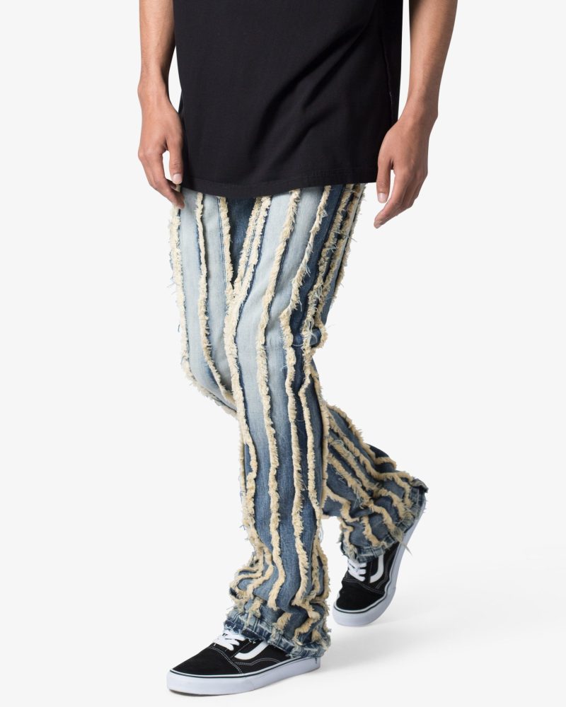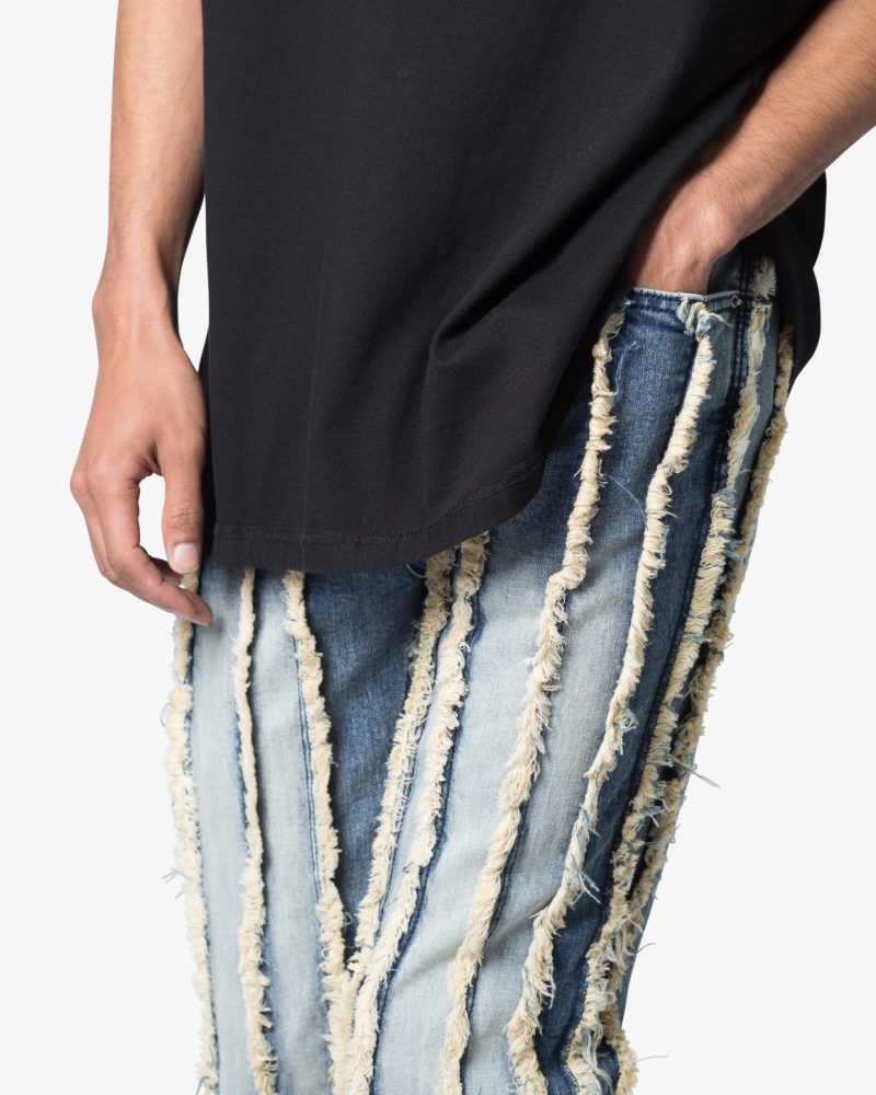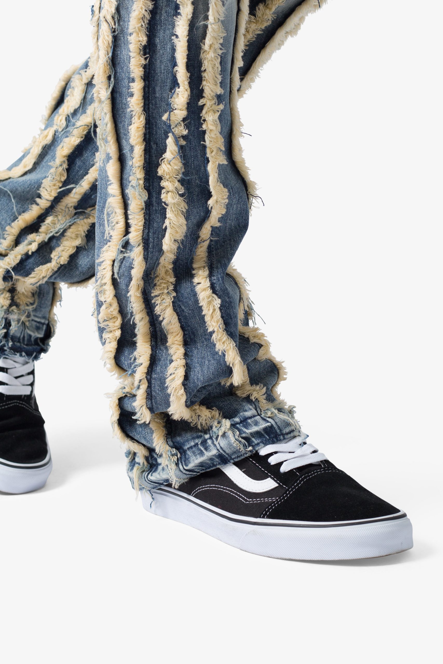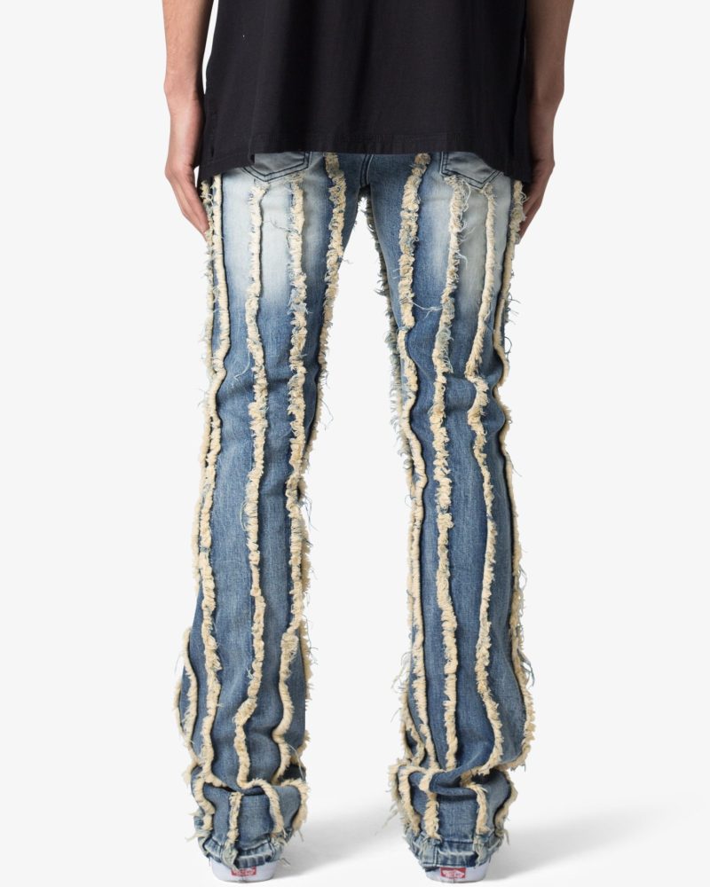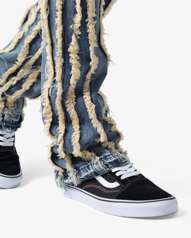 the X641 Skinny Stacked Ripped Denim is designed with our new X fit which is skinny throughout with an extended inseam for stacking and a flare at the leg opening. constructed from stretch denim. and finished with a vintage wash and exposed edge panelling running the length of the denim.