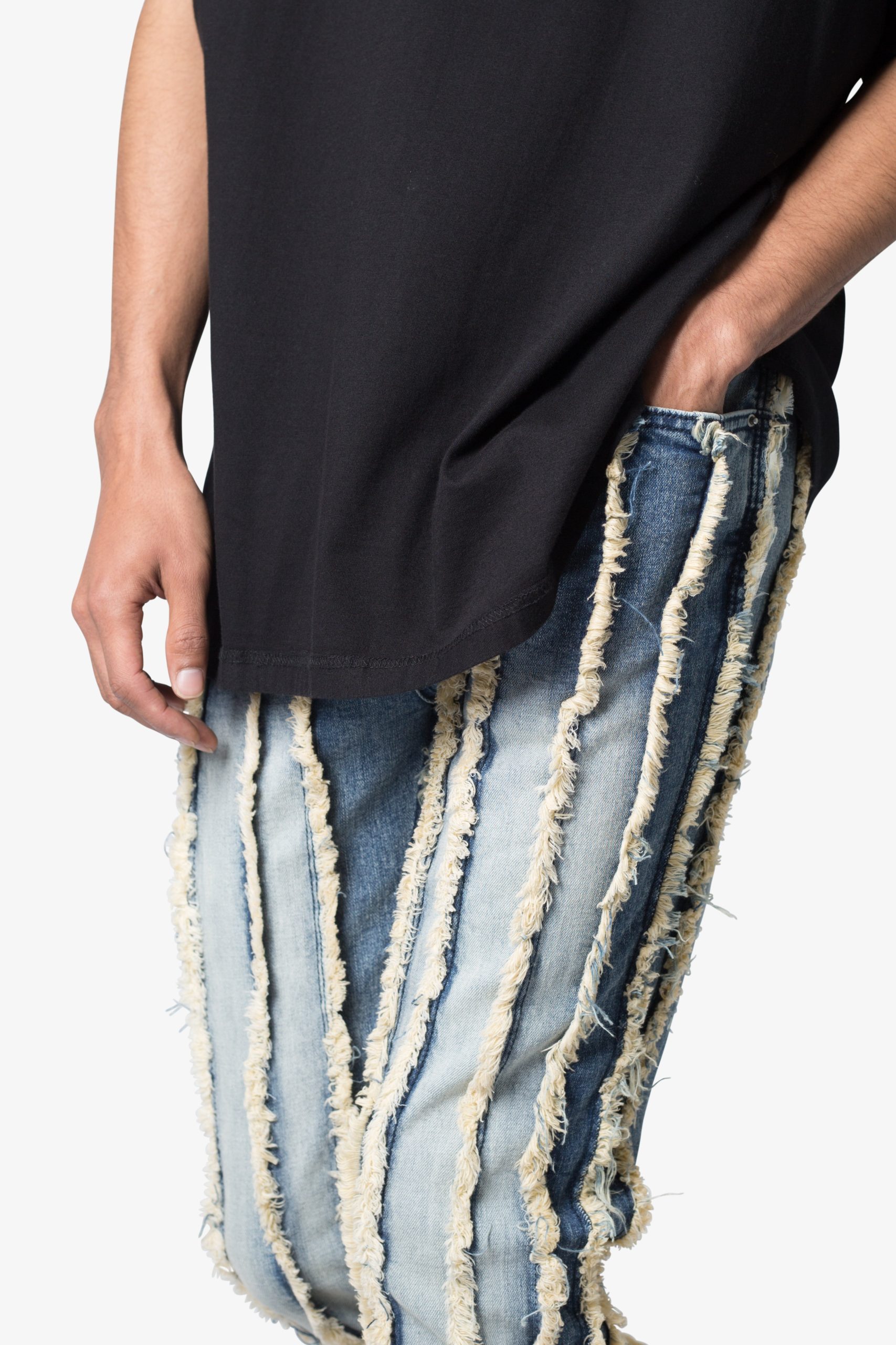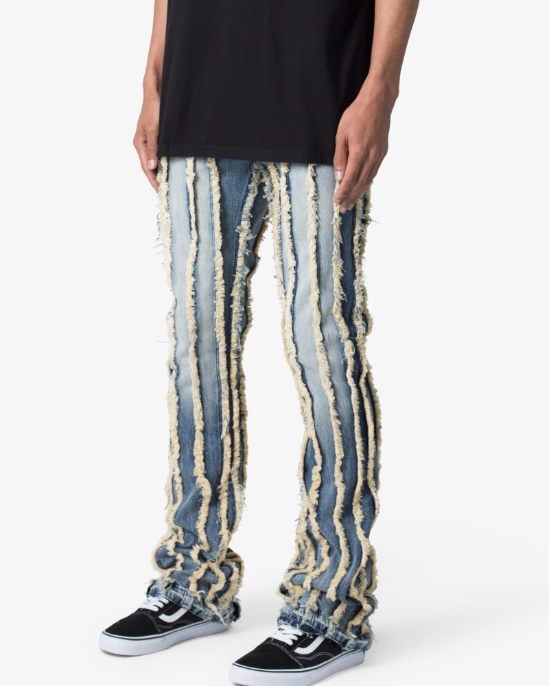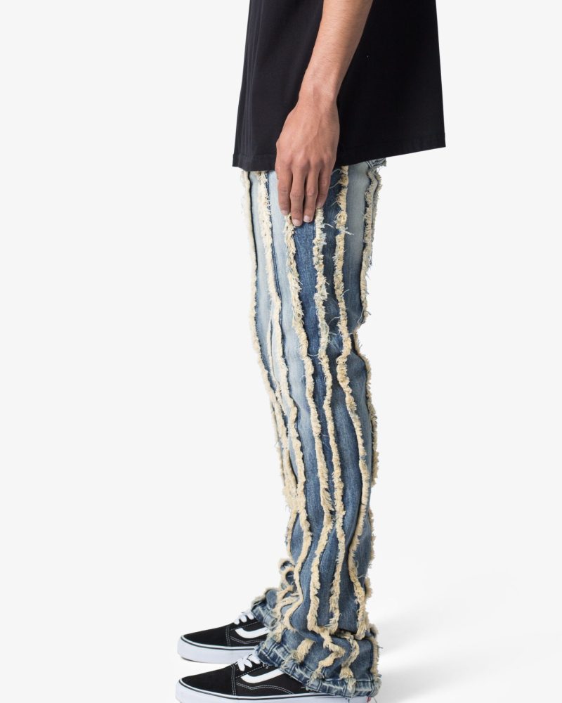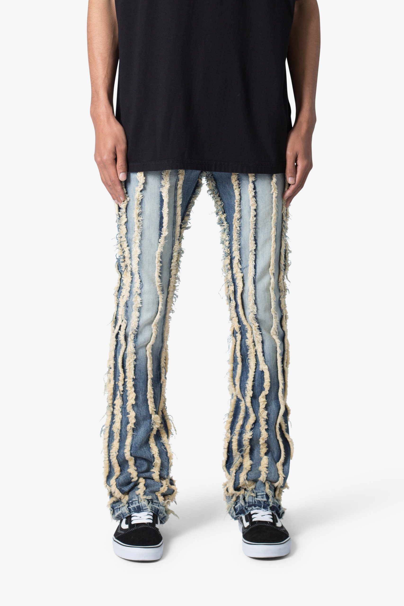the X641 Skinny Stacked Ripped Denim is designed with our new X fit which is skinny throughout with an extended inseam for stacking and a flare at the leg opening. constructed from stretch denim. and finished with a vintage wash and exposed edge panelling running the length of the denim.