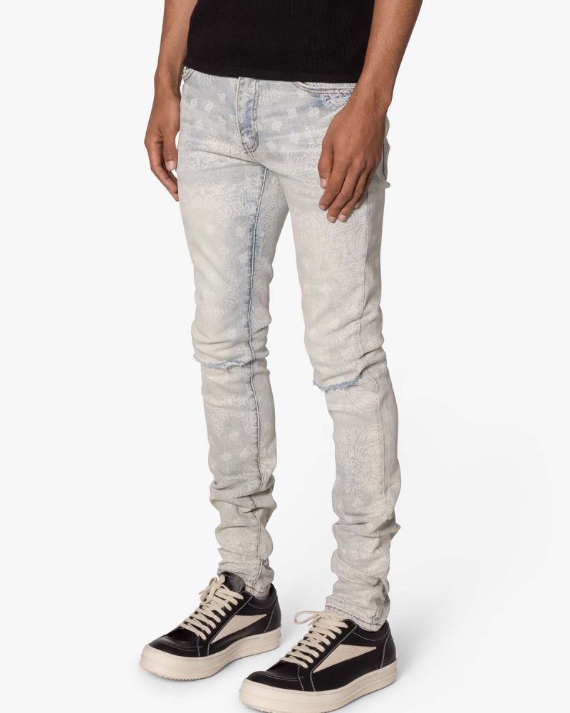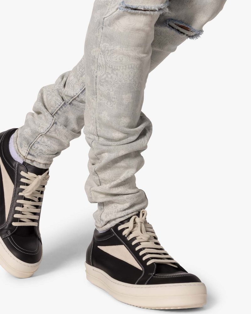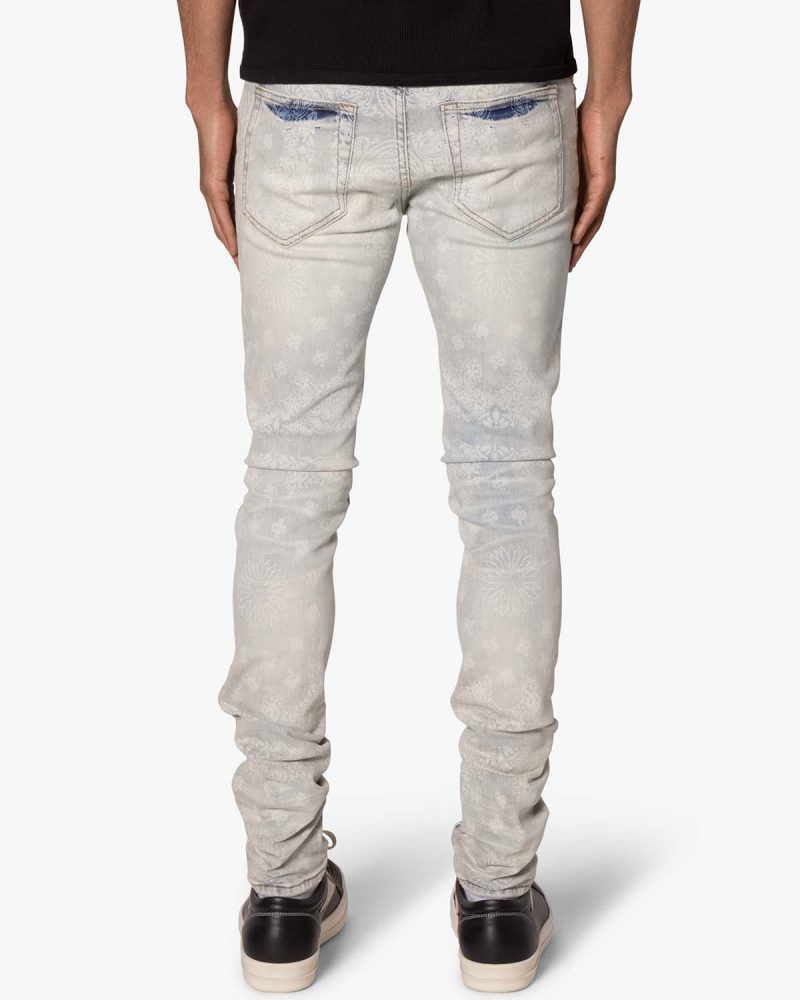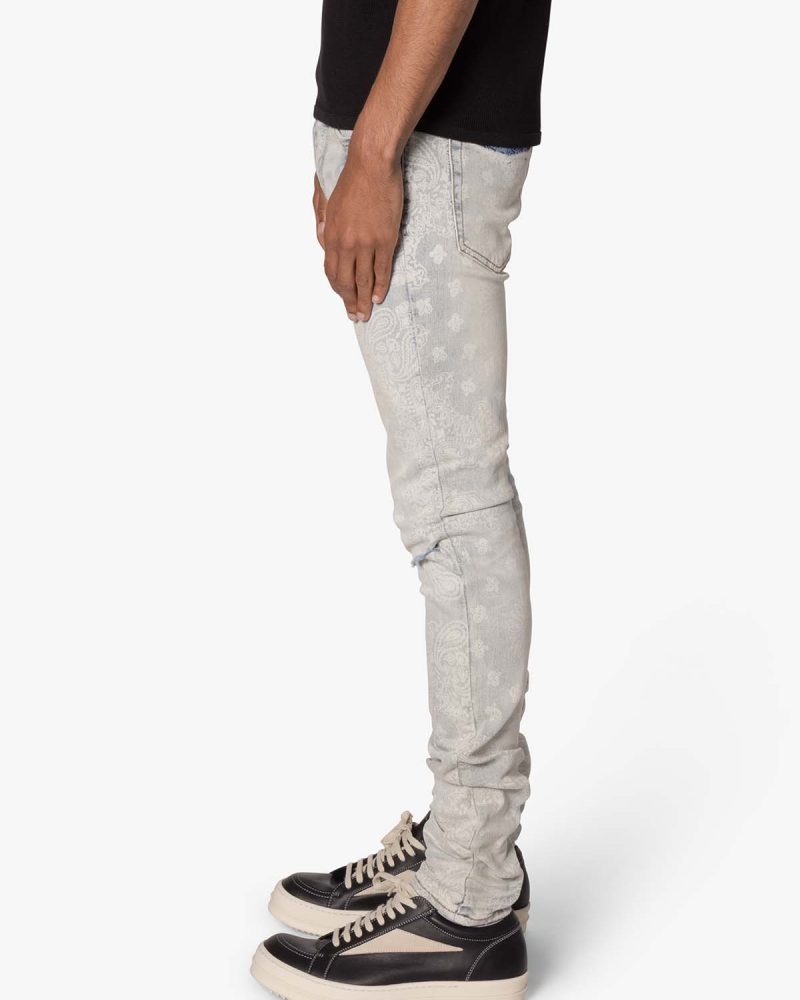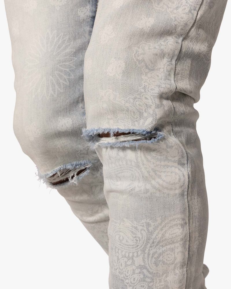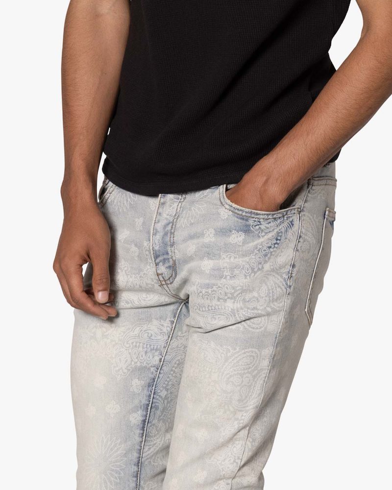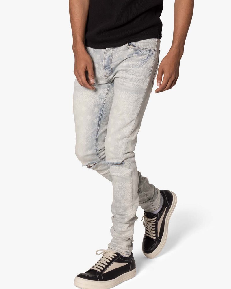 the X696 Paisley Patterned Denim is designed with our X fit which is skinny throughout with an extended inseam for stacking. is constructed from a stretch denim with a vintage wash. and is finished with a lasered paisley pattern throughout.