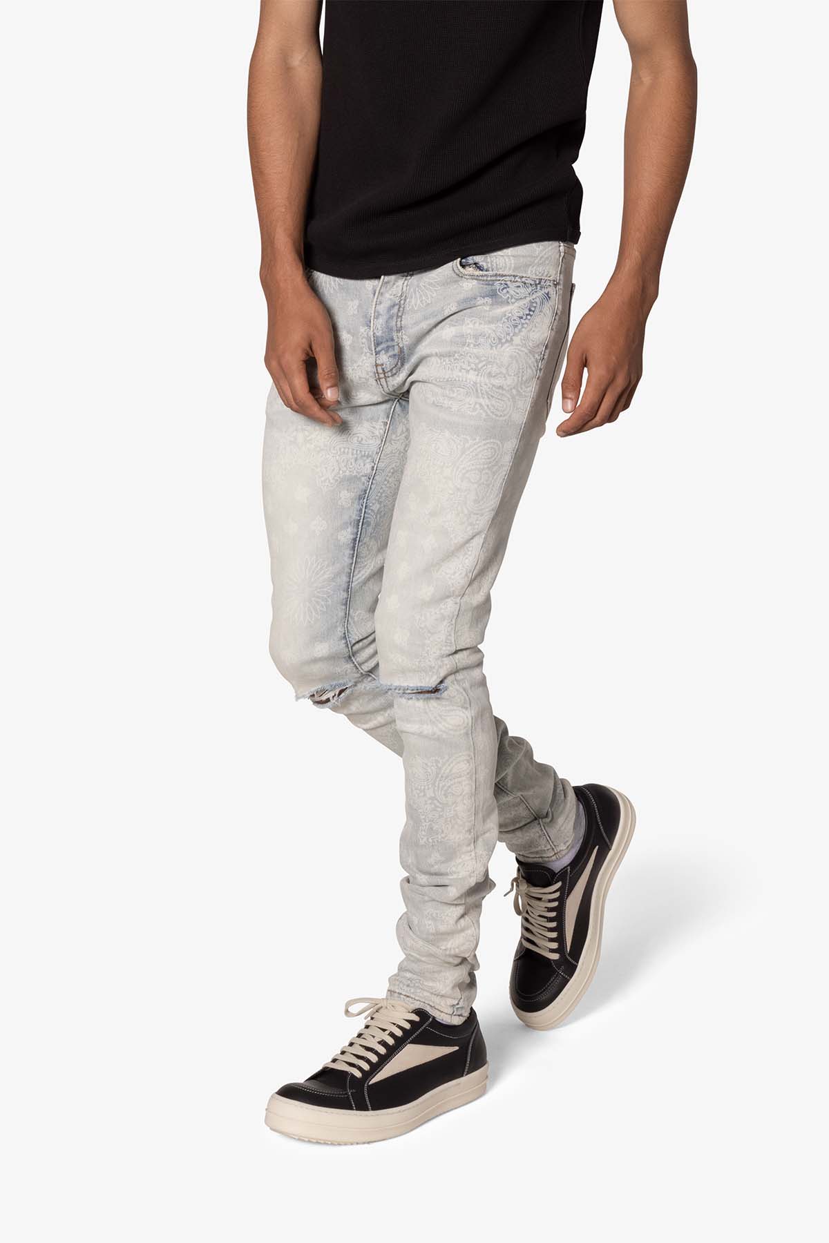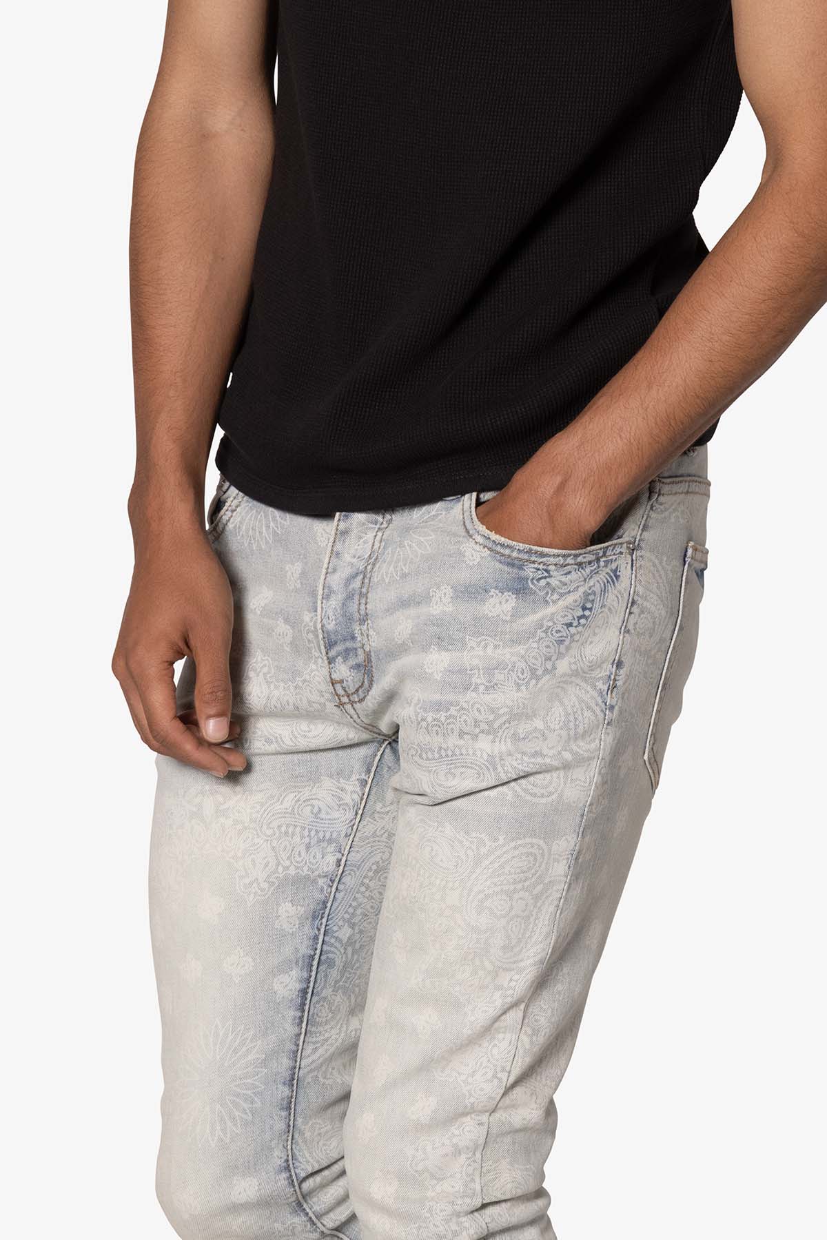 the X696 Paisley Patterned Denim is designed with our X fit which is skinny throughout with an extended inseam for stacking. is constructed from a stretch denim with a vintage wash. and is finished with a lasered paisley pattern throughout.