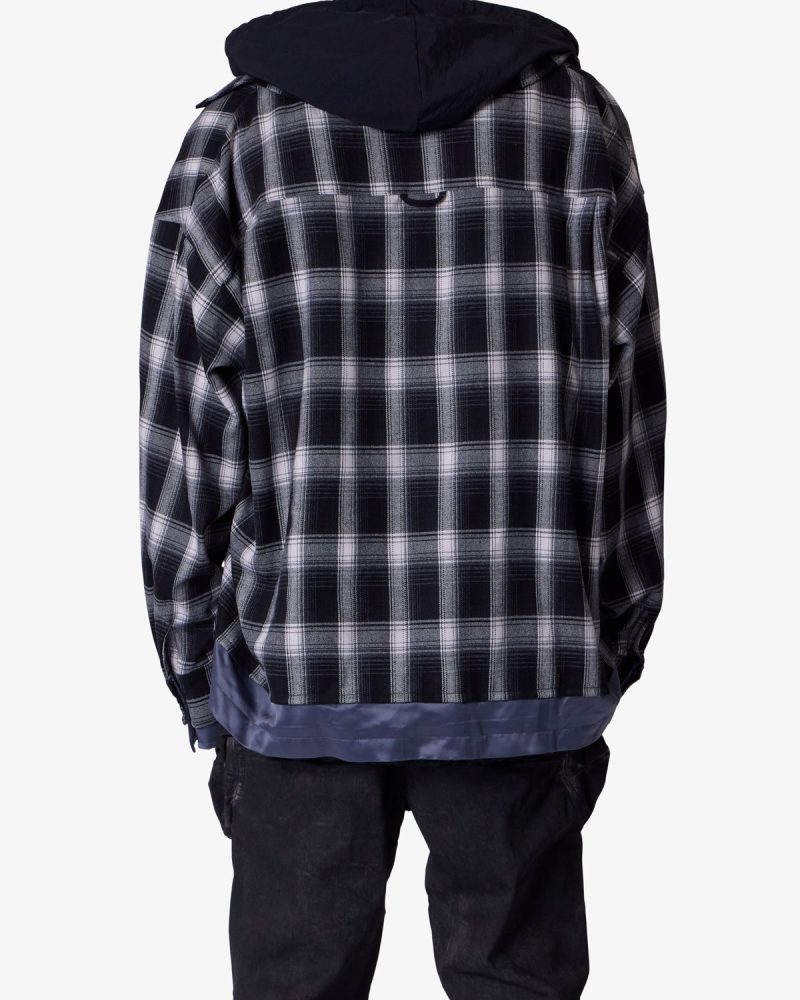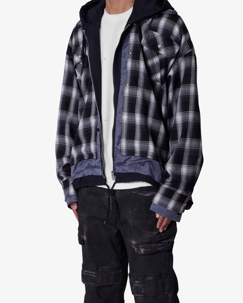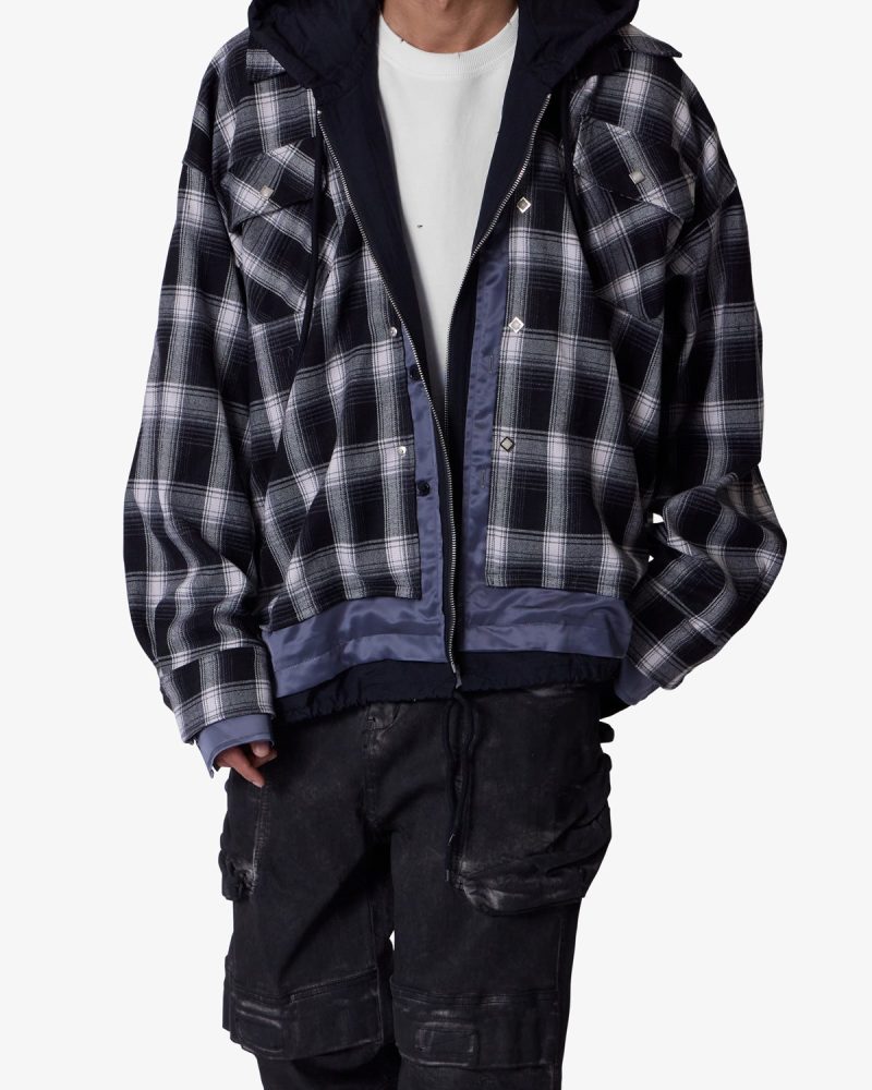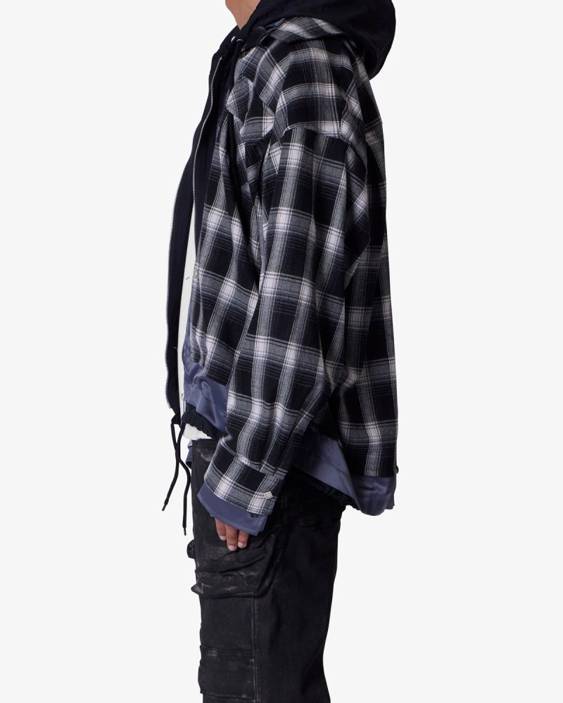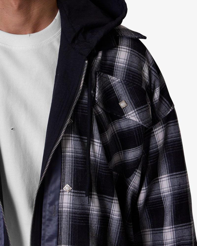 the Zipped Up Flannel Jacket is designed in a relaxed fit from a multi-color plaid fabric. satin. and french terry that are panelled together. zipper placket and button details. and finished with a french terry hood.