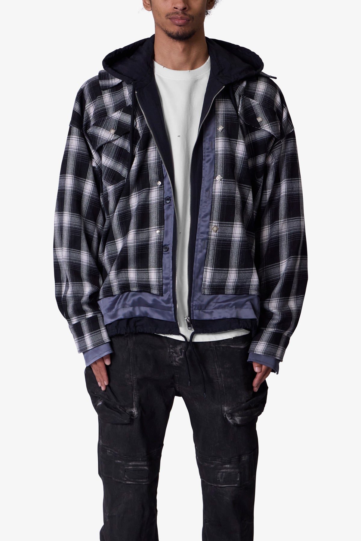 the Zipped Up Flannel Jacket is designed in a relaxed fit from a multi-color plaid fabric. satin. and french terry that are panelled together. zipper placket and button details. and finished with a french terry hood.