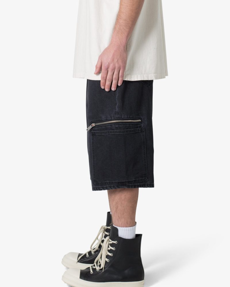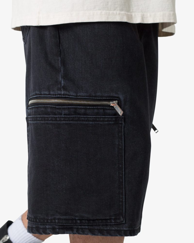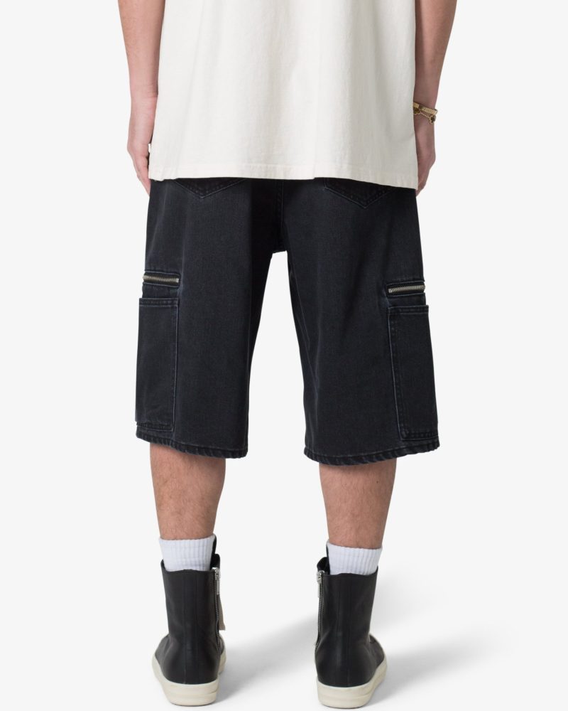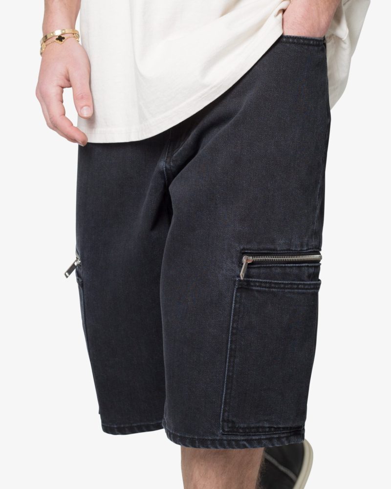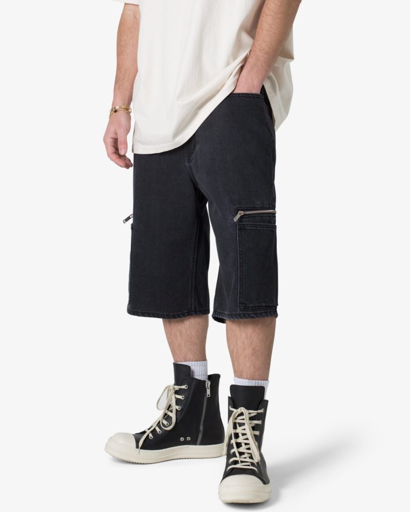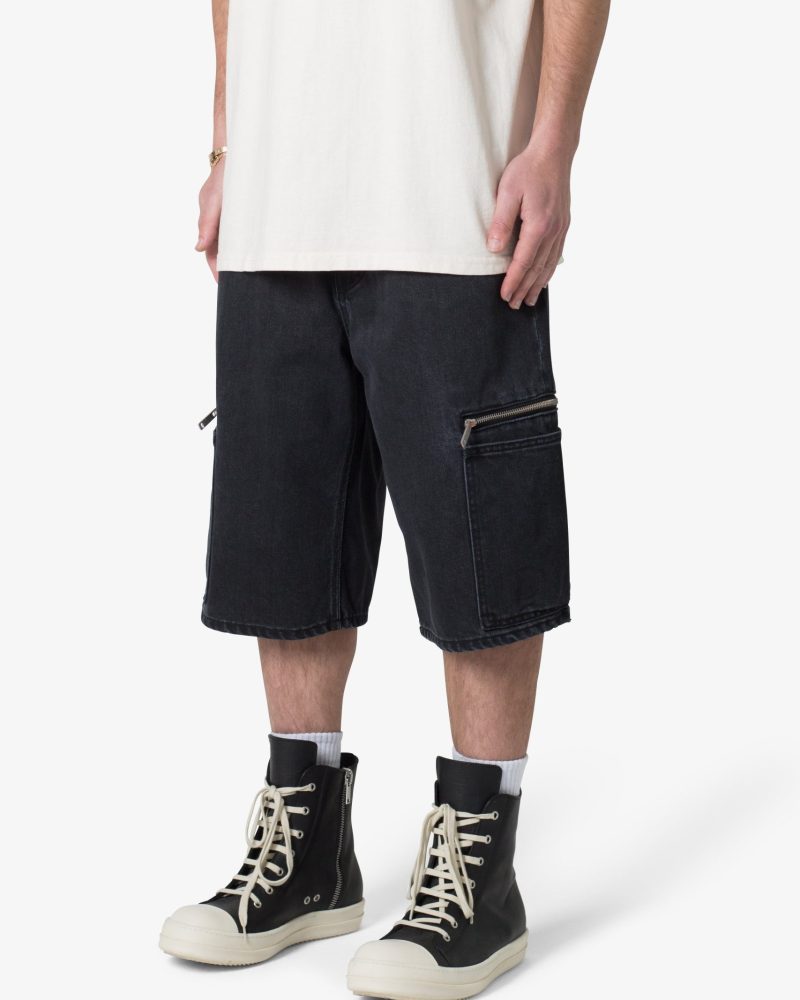 the Zipper Baggy Denim Shorts are designed with a relaxed fit throughout. extended inseam length for a vintage inspired fit. constructed from a vintage washed black cotton denim. and finished off with zipper closure pockets at the outseam.